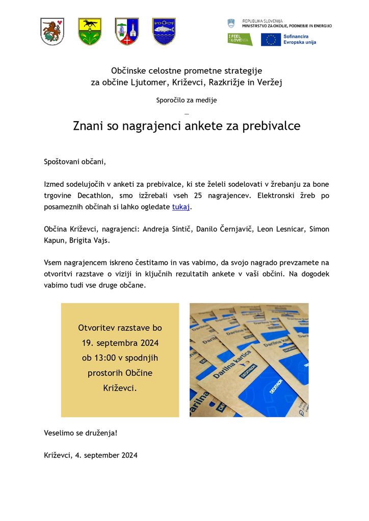 Znani so nagrajenci ankete za prebivalce -Občinske celostne prometne strategije