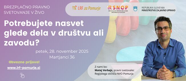 Svetovanje je na voljo predstavnikom društev, zveze društev ali zavodov iz Pomurja ali vsem, ki bi želeli ustanoviti zavod / društvo / zvezo društev v naši regiji in bo potekalo individualno pred delavnico in sicer v petek,  28. novembra 2025 na sedežu LRF za Pomurje v Martjancih. Vsi, ki ste zainteresirani za podporo oz. svetovanje, si morate predhodno rezervirati termin preko prijavnice, kjer lahko označite tudi želeni termin. Število prostih terminov je omejeno na 5 organizacij.