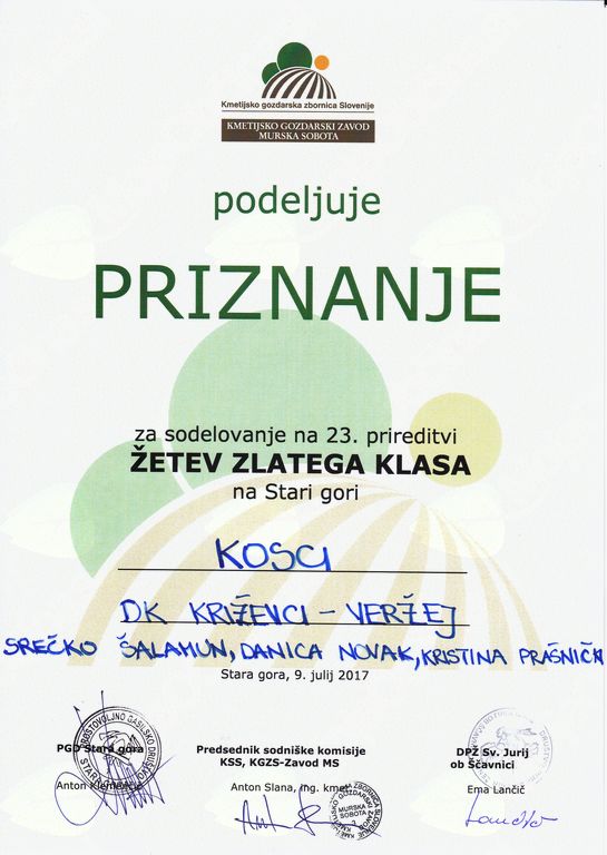 V nedeljo, 9. julija je na Stari Gori potekala, sedaj že triindvajsetič zapovrstjo, prireditev Žetev zlatega klasa. Letos se je dogodka prvič udeležilo tudi Društvo kmetic Križevci – Veržej. Namen tekmovanja je, da se ohrani spomin na čase, ko so se ta opravila vršila ročno. Zato so tekmovalci želi s srpi in kosami. Tričlanske ekipe sta predstavljali dve ženski, ki sta bili pobiralki in en moški kot kosec. Društvo kmetic Križevci Veržej so zastopali Danica Novak, Srečko Šalamun in Kristina Prašnički. Med sedmimi uvrščenimi ekipami, je zmagala skupina iz Drakovcev, križevsko – veržejska naveza pa je zasedla četrto mesto ter za sodelovanje in prikaz dela prejela priznanje.