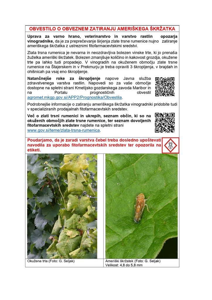 OBVESTILO: O obveznem zatiranju ameriškega škržatka zaradi preprečevanja širjenja zlate trsne rumenice