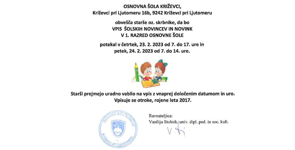 Vpis šolskih novincev in novink v 1. razred OŠ Križevci