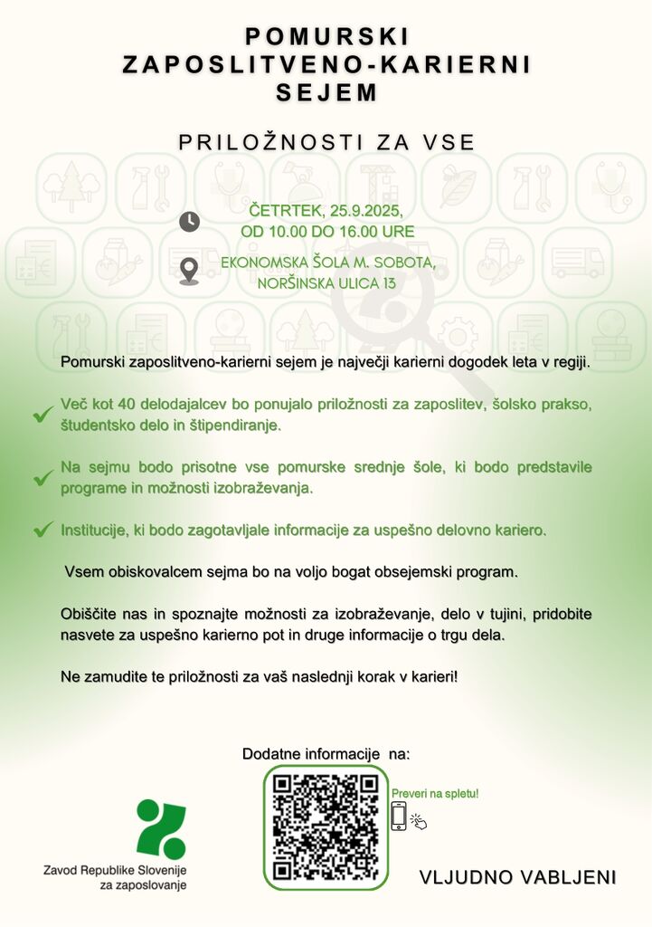 Zavod RS za zaposlovanje, Območna služba Murska Sobota, v četrtek, 25.septembra 2025 od 10.00 do 16.00 ure organizira največji regijski zaposlitveno - karierni dogodek leta: POMURSKI ZAPOSLITVENO - KARIERNI SEJEM. Dogodek se bo odvijal v prostorih Ekonomske šole Murska Sobota na Noršinski ulici 13 v M. Soboti. Na njem se bo predstavilo več kot 60 sodelujočih: delodajalci, institucije, ki delujejo na trgu dela in vse srednje šole iz Pomurja. Vzporedno bo potekal bogat ob-sejemski program, kjer se bodo obiskovalci lahko informirali o prostih delovnih mestih, možnostih izobraževanja, dela v tujini, štipendijah, šolski praksi, študentskem delu, spoznali bodo razne poklice in prejeli številne druge pomembne informacije o trgu dela in karierni poti.