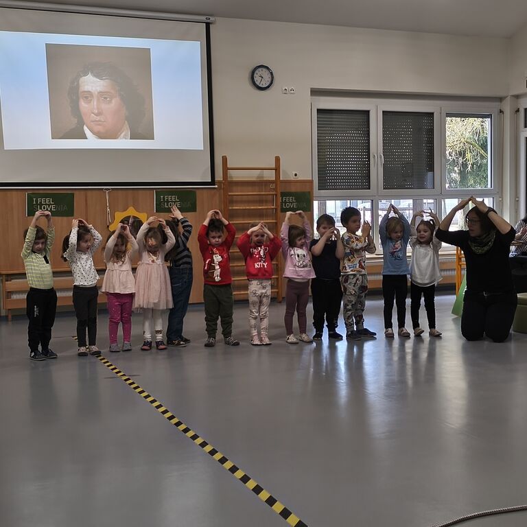 V vrtcu smo izvajali različne dejavnosti (v sliki, pesmi, plesu in besedi) posvečene slovenskemu kulturnemu prazniku. Otroke skozi celo leto vzgajamo v smislu kulturnih vrednot (kulturno obnašanje, kultura do knjig, igrač, vrstnikov, odraslih….) ter spoštovanja do pisane in govorjene besede. Kulturni praznik pa smo obeležili z vrtčevsko proslavo, ki so se ga udeležili vsi otroci našega vrtca, od najmlajših do najstarejših. S slovensko himno, plesno igro Prešernovega Povodnega moža, predstavitvijo pesnika, plesom in deklamacijami smo otrokom približali praznik kulture.