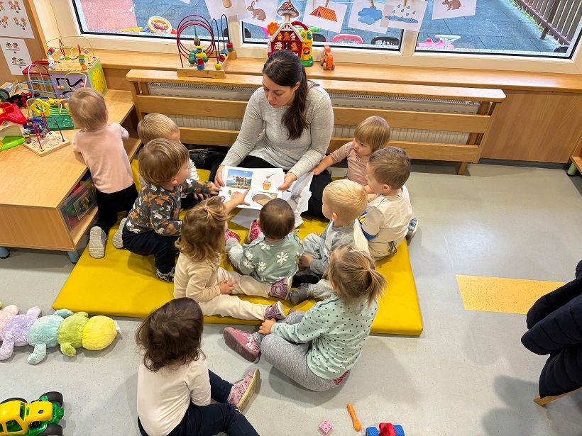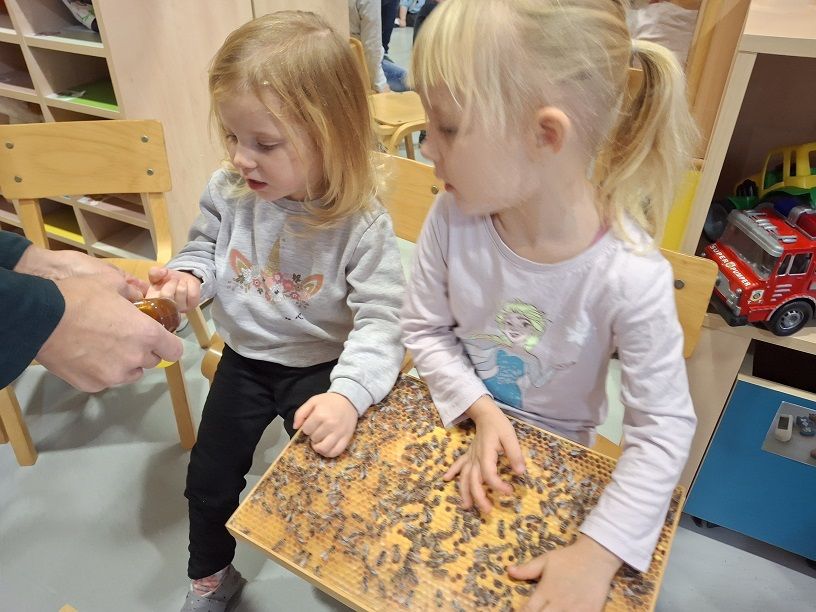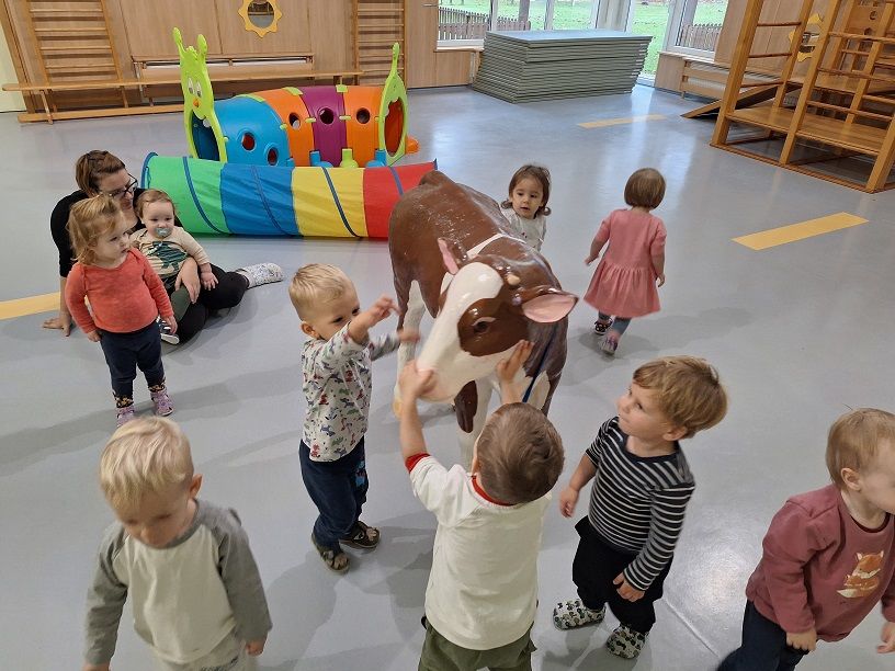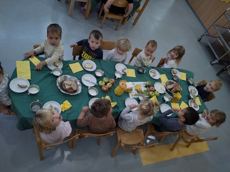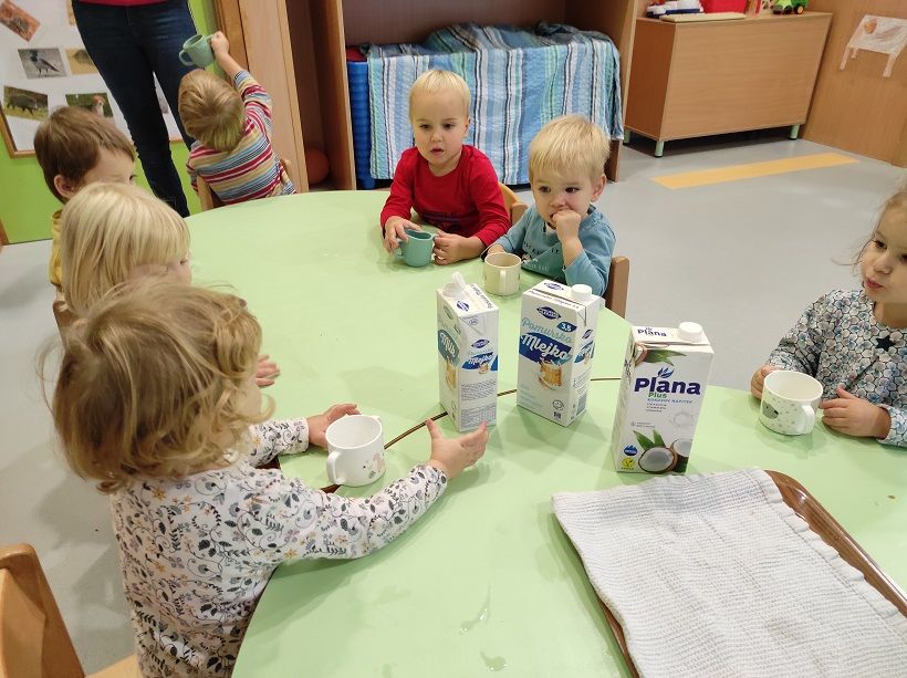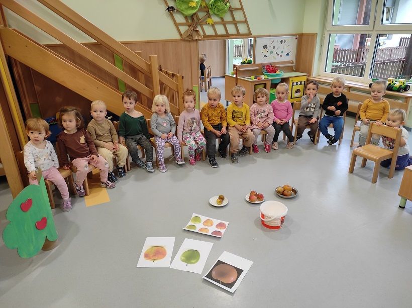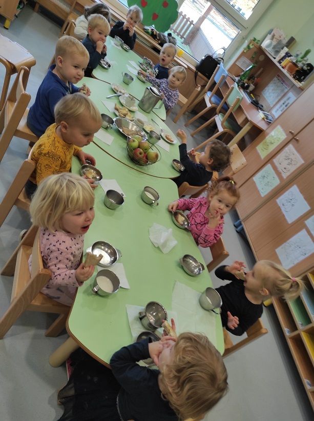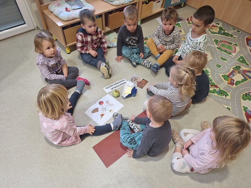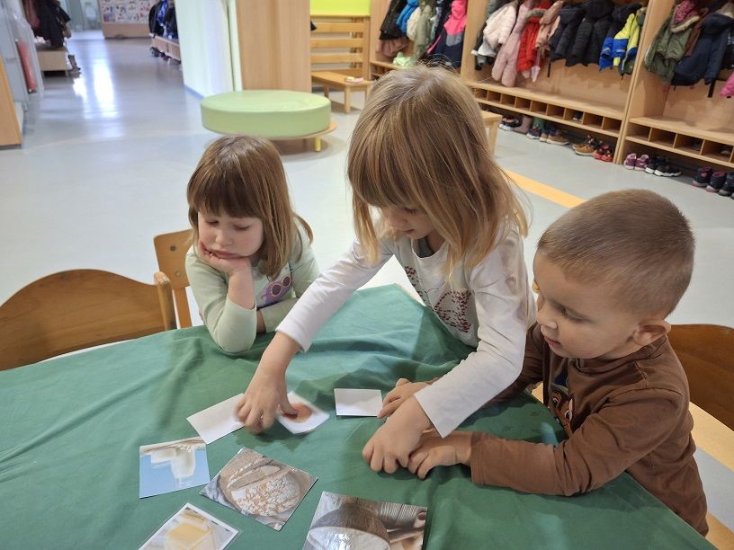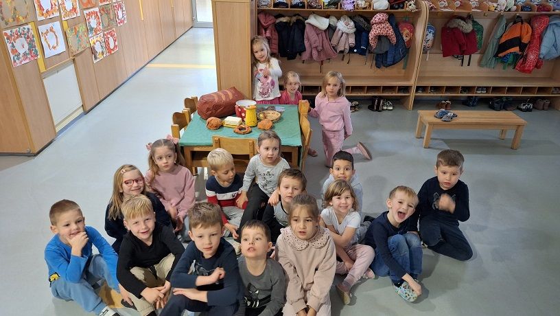 Vse te sestavine smo čez teden spoznavali in se o njih pogovarjali. Ugotavljali smo na katerem drevesu zrastejo jabolka, katere živalice nam pridno pomagajo in naberejo med, naučili smo se, da krave dajo mleko, prav tako pa je mlečni izdelek tudi maslo. Vemo tudi, da za kruh rabimo moko.