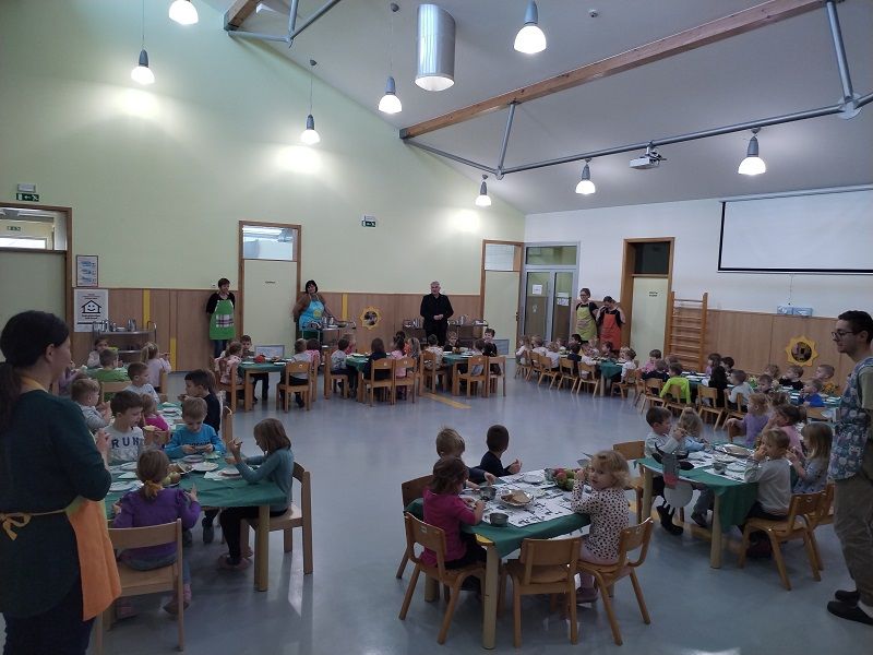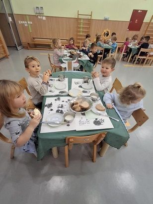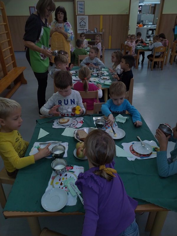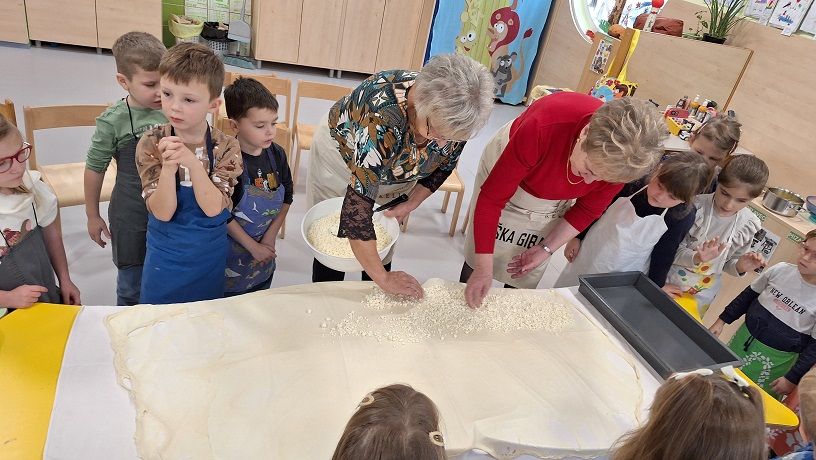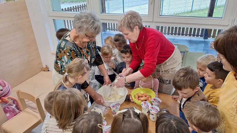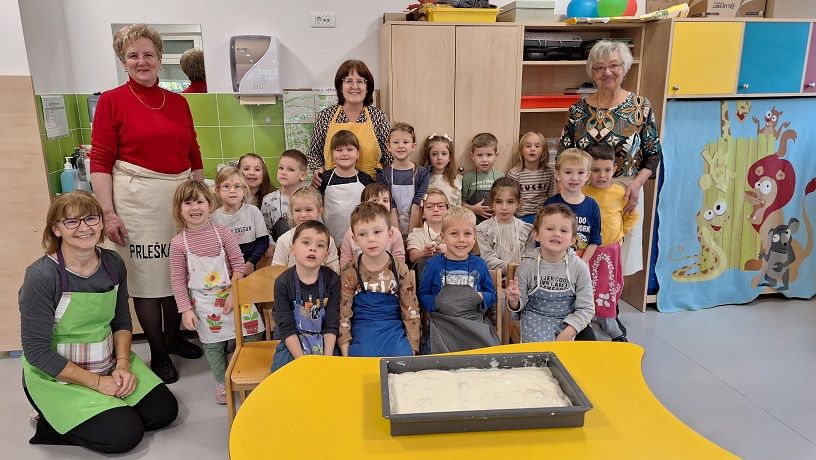V vrtec smo povabili upokojeni strokovni delavki Majdo Vrbnjak in Lidijo Koroša, ki sta z otroki najstarejše skupine pripravljali in pekli tradicionalno prleško gibanico. Otrokom sta prikazali kako se zamesi testo in pripravi nadev. Otroci so z veseljem sodelovali. Naredili so toliko gibanic, da smo se z njimi lahko posladkali prav vsi otroci in zaposleni v vrtcu.