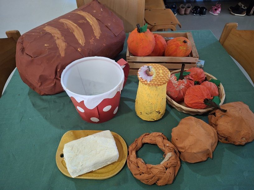 Vsaka izmed starejših skupin je iz odpadnega materiala izdelala po eno izmed sestavin zajtrka, ki smo jih razstavili na lepo pogrnjeni mizi.
