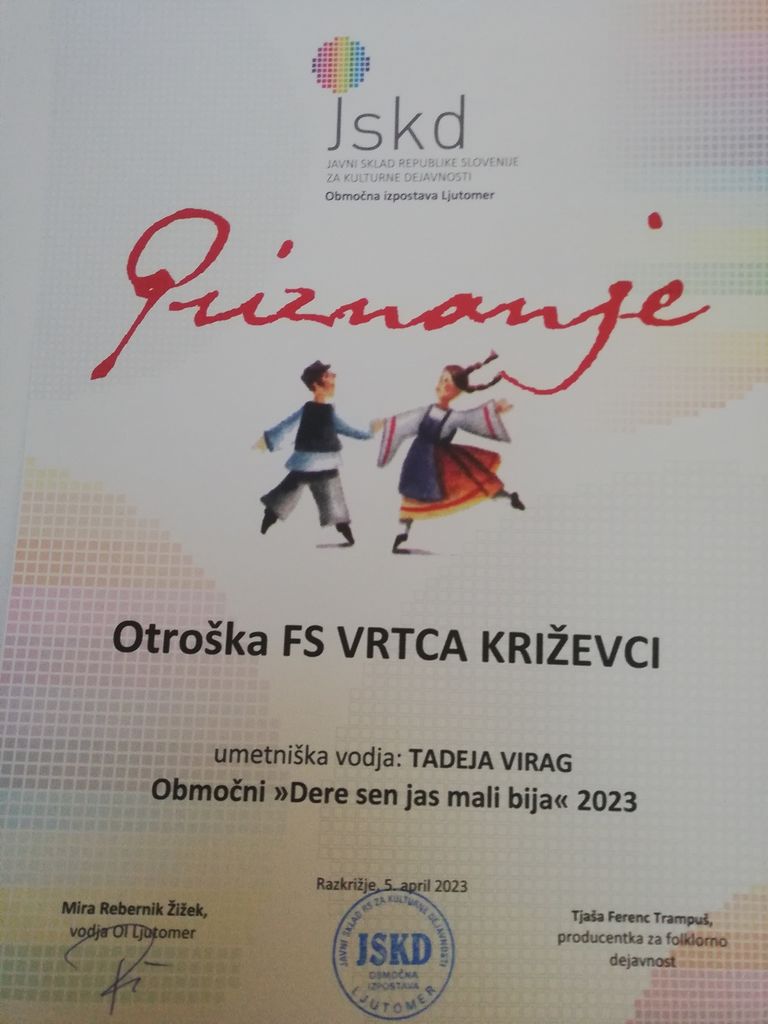 V sredo, 5.4.2023 je v Domu kulture Razkrižje potekalo območno srečanje otroških folklornih skupin občin Ljutomer, Veržej, Razkrižje in Križevci. Najstarejši otroci našega vrtca (oddelek 5-6 let) so nastopili s koreografijo Lušno v vrtec je hoditi pod mentorstvom Tadeje Virag in Dragice Koroša.