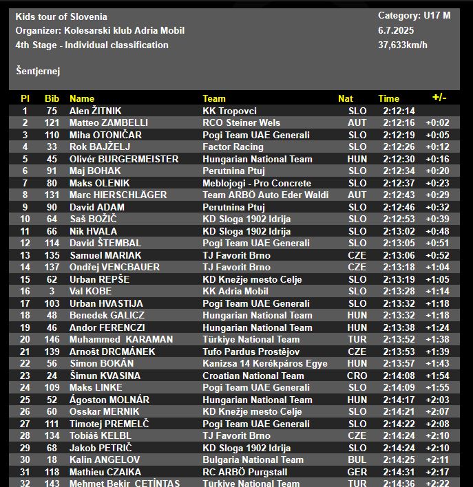 Alen je etapo končal v prvi skupini na 7. mestu in dirko v skupnem seštevku zaključil kot ZMAGOVALEC, 2 sekundi pred drugouvrščenim Matteom Zambellijom (RCO Steiner Wels) in 5 sekund pred Mihom Otoničarom (Pogi Team UAE Genarali). V Alenovi kategoriji mlajših mladincev je nastopilo 149 tekmovalcev iz 14 različnih držav.