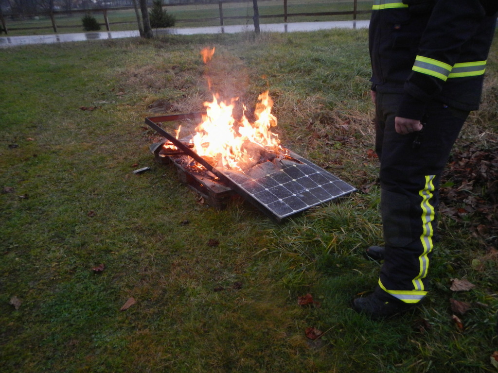 Ravno o požarih na fotovoltaičnih elektrarnah se je govorilo v četrtem sklopu izobraževanja, ko se je postavila improvizirana elektrarna. Udeleženci so se seznanili z njenim delovanjem ter opredelitvijo izmeničnega in enosmernega toka pri delovanju sončne elektrarne. Predstavili so poškodovane panele sončne elektrarne in nevarnosti, ki izhajajo iz poškodb. Panel so tudi zažgali ter so se tako neposredno predstavile nevarnosti, ki izhajajo iz požara in strupene lastnosti materialov. Poseben poudarek je bil na pravilnosti postopkov gašenja in izbiri pravilnega curka. Ravno pri slednjem je bilo pri udeležencih začutiti nekaj vznemirjenja, saj je vsak moral z vodo pogasiti improviziran objekt pod napetostjo. Vodni curek je namreč moral usmeriti na gole električne vodnike, ki so bili pod napetostjo 380 V.