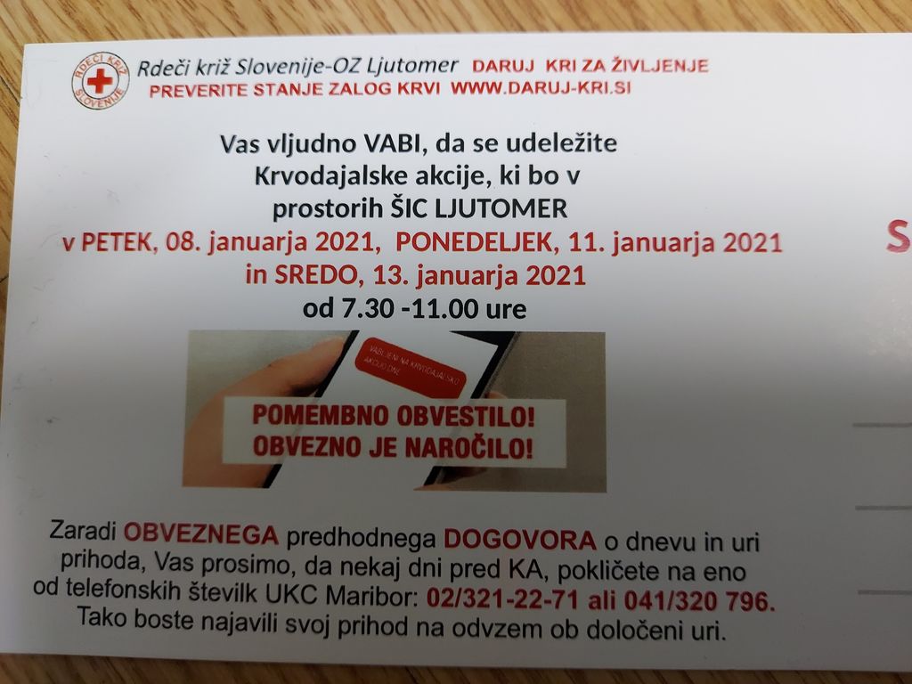 V petek, 8. januarja 2021 ter v ponedeljek, 11. januarja 2021 in sredo 13. januarja 2021 od 7:30 - 11:00 ure bo potekala krvodajalska akcija v prostorih ŠIC Ljutomer.