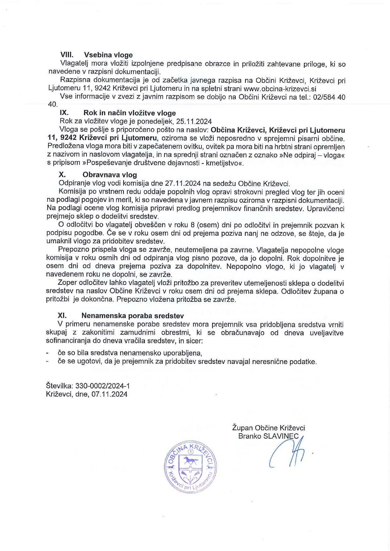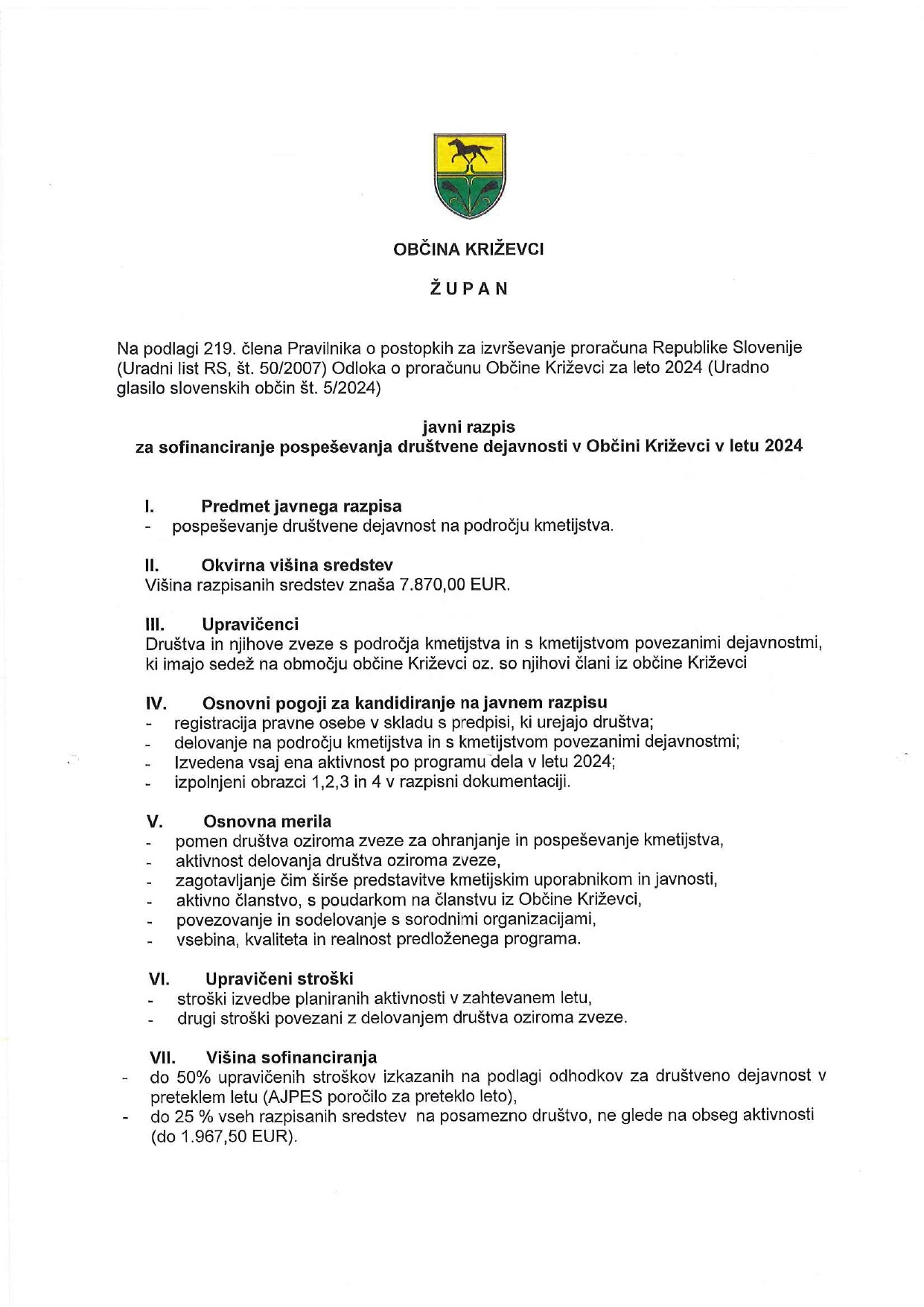 Javni razpis za sofinanciranje pospeševanja društvene dejavnosti na področju kmetijstva v Občini Križevci v letu 2024