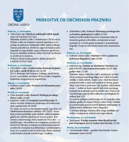 • Aškerčev trg: Nedelja na Martinovo: Martinov sejem (od 8.00), Slavnostna sveta maša (10.30), Blagoslov vina (11.30) Martinov sejem vsako leto vabi s stojnicami, na katerih bo poleg kramarskega blaga moč videti in kupiti izdelke iz tistih dobrih, starih časov. Med številnimi stojničarji bodo z nami tudi medičar in lectar, gospodinje s pecivom in poticami, čaji, medom, suhorobarji, kovač … Lahko se boste najedli tudi sveže pečenega kostanja ter poskušali mošt in mlado vino. Pravica do Martinovega sejma je bila Laškemu s privilegijem dodeljena leta 1227.