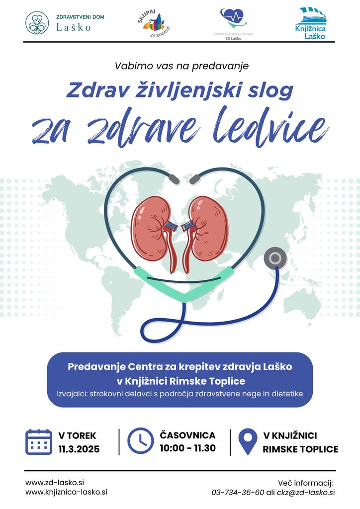 Vsak drugi četrtek v mesecu marcu obeležujemo Svetovni dan ledvic, letos je to 13. marec. Namen dneva je ozaveščati ljudi o delovanju ledvic in skrbi za zdravje ledvic, preprečevanju ledvične bolezni in tudi zgodnje odkrivanje kronične ledvične bolezni pri posamezniku. V kolikor vas zanima več o tematiki, vljudni vabljeni, da se udeležite predavanja ZDRAV ŽIVLJENJSKI SLOG ZA ZDRAVE LEDVICE, ki se bo odvijalo 11.3.2025 ob 10.uri v prostorih knjižnice Rimske Toplice. Predavanje bo v sodelovanju s Knjižnico Rimske Toplice izvedel Centrer za krepitev zdravja Laško, predavali bodo strokovni delavci s področja zdravstvene nege in dietetike.
