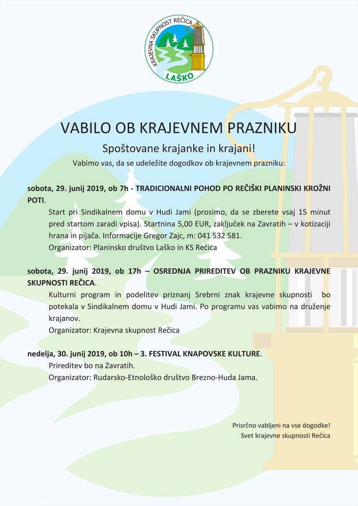 Krajevna skupnost Rečica v soboto, 29. junija, prireja vrsto dogodkov ob praznovanje krajevnega praznika.Praznovanje se bo začelo s tradicionalnim Pohodom po rečiški planinski krožni poti, nadaljevalo z osrednjo prireditvijo s kulturnim programom in podelitvijo priznanj. V nedeljo pa bo na Zavratih sledil še 3. festival knapovsek kulture.