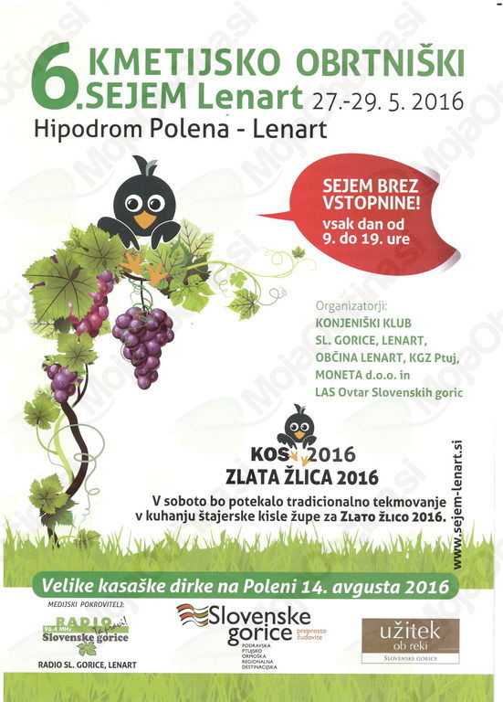 Vabljeni na sejemsko prireditev - 6. KMETIJSKO OBRTNIŠKI SEJEM (KOS) LENART, ki bo potekala od 27. do 29. maja 2016 na hipodromu Polena - Lenart.