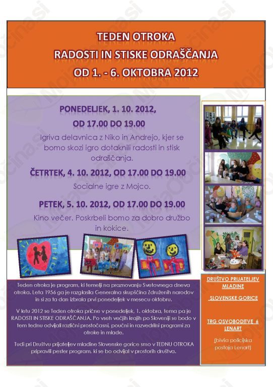 Tudi pri Društvu prijateljev mladine Slovenske gorice smo v TEDNU OTROKA pripravili pester program, ki se bo odvijal v prostorih društva.