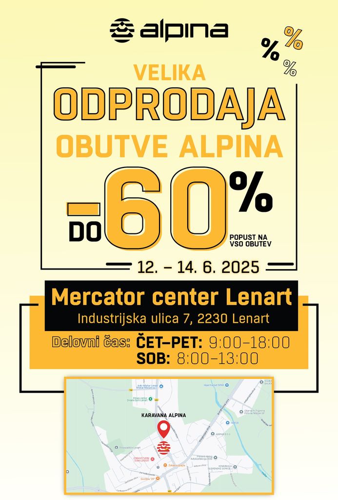 V Mercatorjevem centru Lenart bo od četrtka, 12. junija do sobote, 14. junija 2025, potekala velika odprodaja Alpinine obutve po znižanih cenah – popusti segajo vse do 60%!