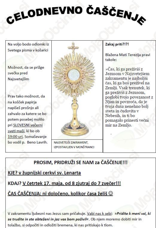 V župnijski cerkvi svetega Lenarta bodo v četrtek 17. maja 2012, na praznik Gospodovega vnebohoda od 8. ure zjutraj do 19. ure potekale celodnevne molitve ali celodnevno čaščenje Sv. Rešnjega Telesa in Krvi.