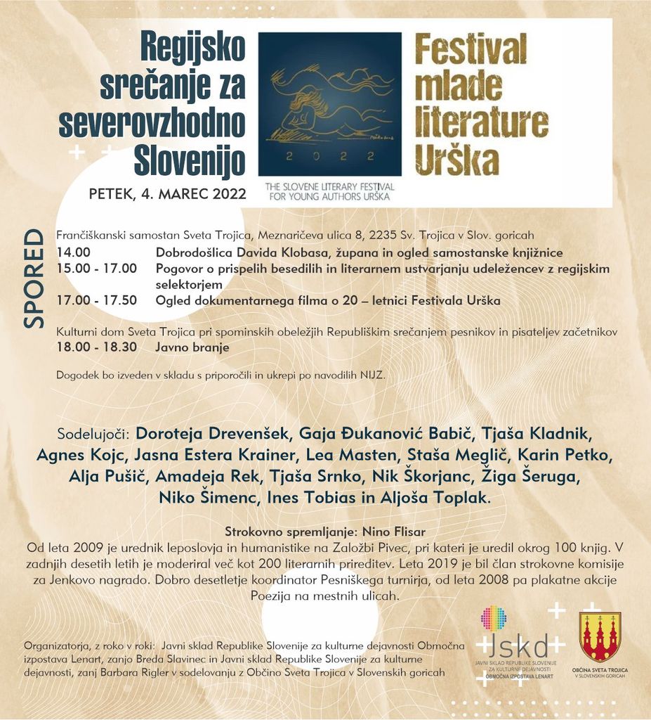 Vabimo Vas, da se udeležite javnega branja udeležencev Festivala mlade literature Urška – regijskega srečanja za SV Slovenijo, ki bo potekalo v petek, 4. marca 2022, ob 18.00 uri pred kulturnim domom v Sveti Trojici.