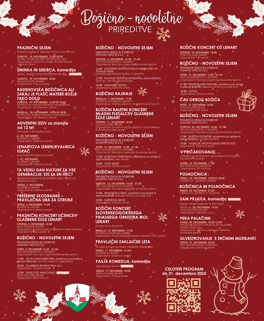 Prižgimo lučke, ki bodo v igri barv in svetlobe ustvarile čaroben advent, božične in novoletne praznike. December bo iskriv in živopisan, poln prazničnega in zabavnega dogajanja. Čas, ko se zahvalimo za vse dobro. Želimo si, da bi nam bilo novo leto naklonjeno, naj nas obdari z lepim in dobrim. Vabimo vas na decembrske dogodke, ustvarili smo jih za vas, naj zaživijo z vami, saj ste tudi vi del njih. Še vedno velja, da je dobra volja najbolja, smeh je čudežno zdravilo, lepa beseda pa lepo mesto najde, ne le v decembru, ampak skozi vse leto. Želimo vam svetlo, srčno, srečno in prijazno 2026!