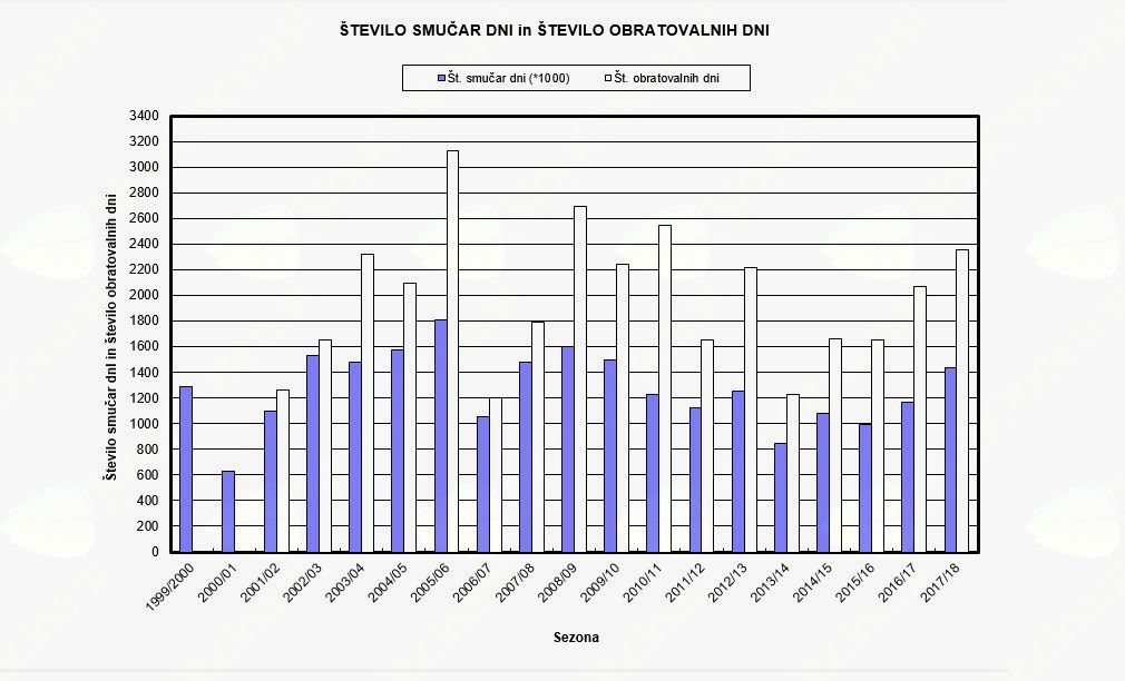 V spodnjem diagramu je prikazano skupno število obratovalnih dni smučišč in skupno število smučarskih obiskovalcev oz. smučar dni (pomeni: prvih vstopov na žičniške naprave) za celotno Slovenijo od sezone 199-2000 naprej.