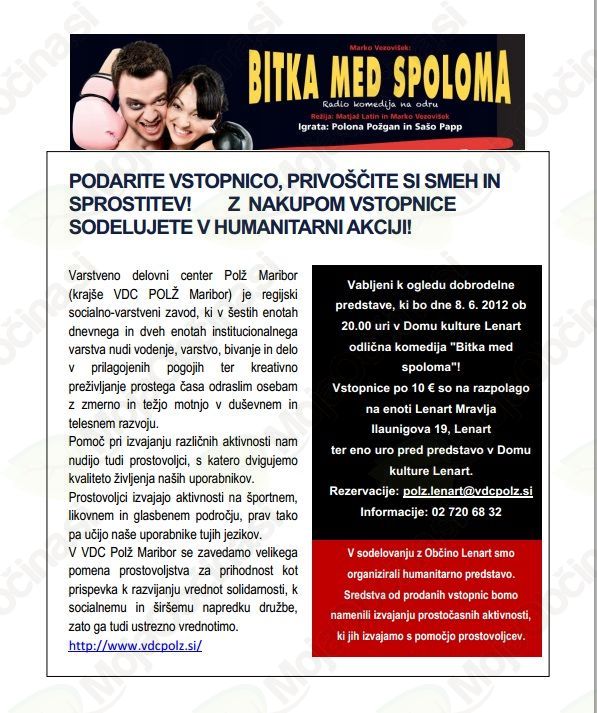 Občina lenart vabi na dobrodelno predstavo Bitka med spoloma, ki bo v petek 8. junija, ob 20. uri bo v Domu kulture Lenart.