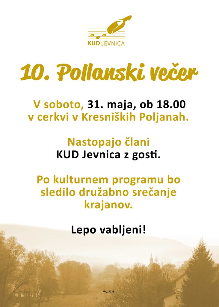 Kulturno-umetniško društvo Jevnica tokrat že desetič organizira kulturno-družabno prireditev Pollanski večer. Prireditev bo postavljena na običajno prizorišče – v poljansko cerkev in na cestišče, na začetku »poljanskega kroga« pri cerkvi.