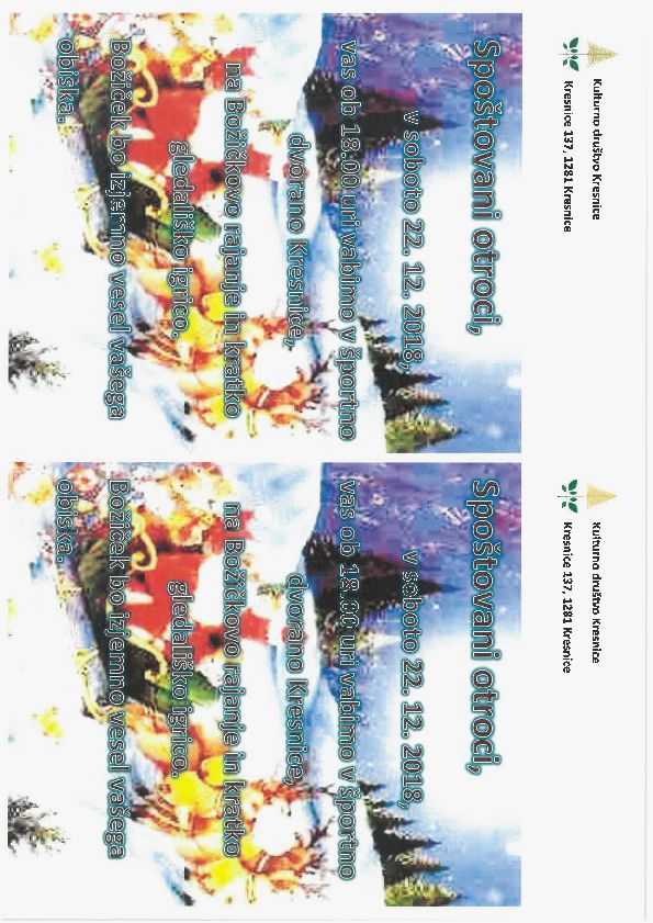 Kulturno društvo Kresnice, v sodelovanju s krajevno skupnostjo, prireja v soboto, dne 22.12.2018, s pričetkom ob 18.00 uri, v športni dvorani Kresnice, Božičkovo rajanje za otroke KS Kresnice.