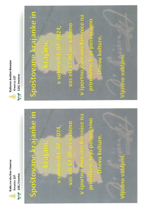 Prireditev v počastitev slovenskega kulturnega praznika v športni dvorani Kresnice, dne 3. 2. 2024, s pričetkom ob 17:00 uri. Vljudno vabljeni!