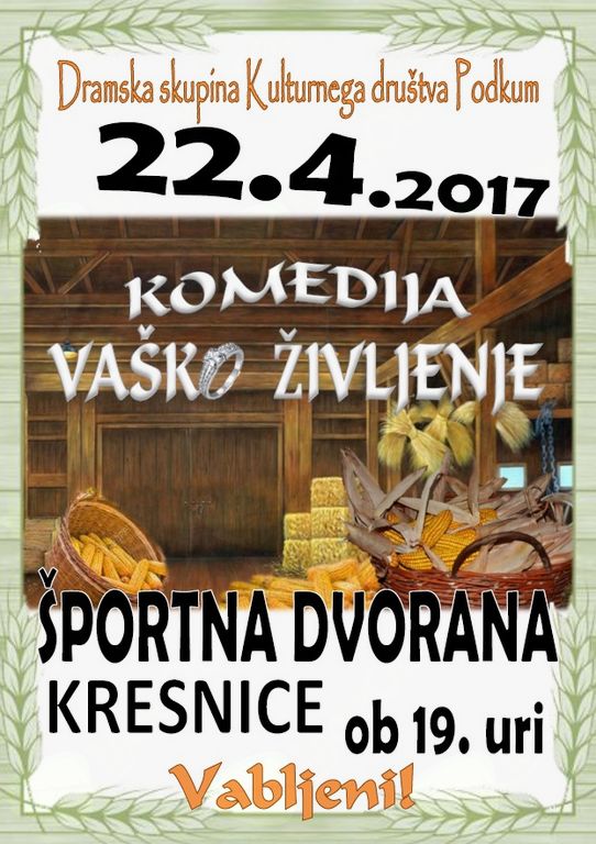 Dne 22.4.2017, ob 19.00 uri, v Športni dvorani Kresnice gostuje dramska skupina iz Podkuma, s komedijo Vaško življenje.
