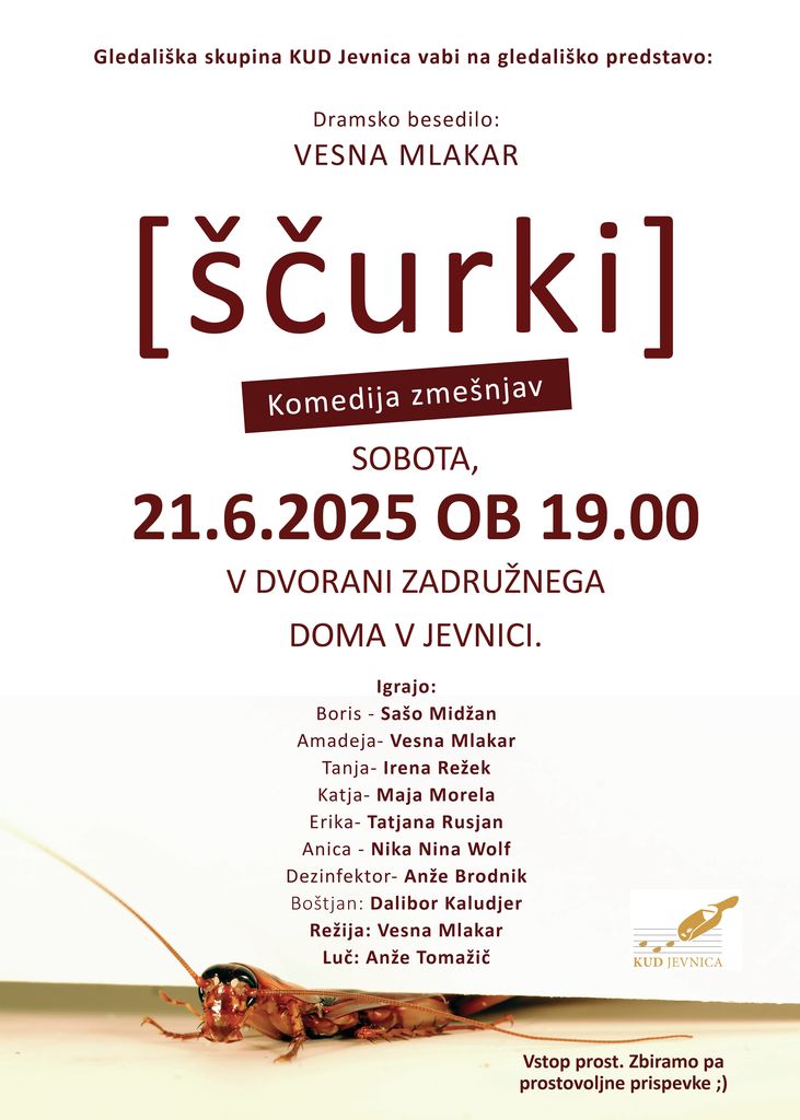 Člani Dramske sekcije KUD Jevnica vas vabijo na ogled komedije zmešnjav [ščurki], ki bo v soboto, 21.6.2025 ob 19.00 uri v dvorani zadružnega doma v Jevnici.