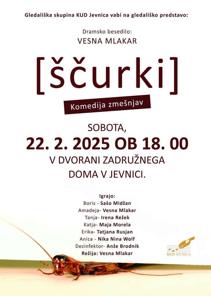 Člani Dramske sekcije KUD Jevnica vas vabijo na komedijo zmešnjav z naslovom [ščurki], ki bo v soboto, 22.2.2025 ob 18.00 uri v dvorani Zadružnega doma v Jevnici. Igrajo domači amaterski igralci.