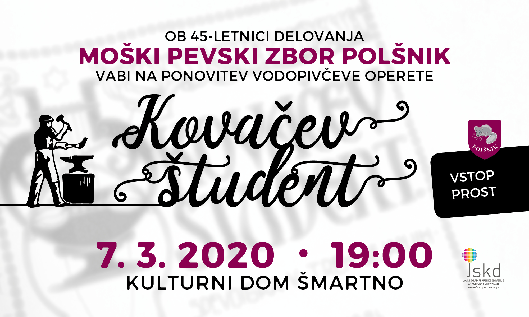 Moški pevski zbor Polšnik se nam bo predstavil z Vodopivčevo opereto Kovačev študent. Kot gostje na koncertu bodo nastopili tudi domačini, člani folklorne skupine Javorje. Prisrčno povabljeni!