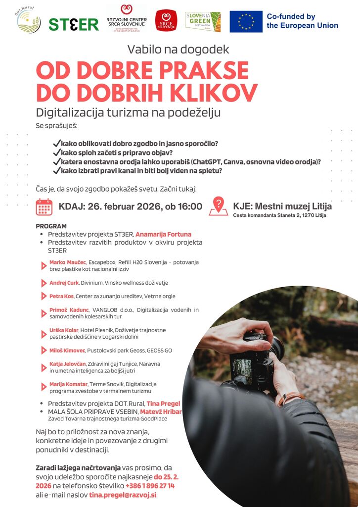 Vljudno vas vabimo, da se nam pridružite. Podrobnosti o programu in prijavi: https://srce-slovenije.si/vabilo-na-dogodek-od-dobre-prakse-do-dobrih-klikov-digitalizacija-turizma-na-podezelju/