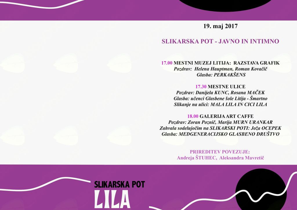 Otvoritev projekta Slikarska pot društva LILA, ki vključuje tri razstave, se bo pričela 19. maja ob 17. uri v Mestnem muzeju Litija in se nadaljevala po litijskih mestnih ulicah ter zaključila v galeriji ART CAFFE. Dogodek bo spremljala glasba, ki jo bodo prispevali učenci Glasbene šole Litija - Šmartno, Medgeneracijsko glasbeno društvo in Perkakšens.