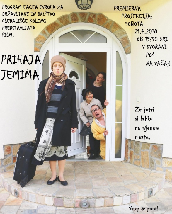 Društvo Gledališče Kolenc skupaj z Društvom GEOSS in Družinskim gledališčem Kolenc v okviru programa Evropa za državljane, ki ga uresničuje 13 partnerjev iz 8 evropskih držav, predstavlja srčno, ganljivo in zabavno filmsko komedijo za mladostnike in odrasle - o emigrantski deklici Jemimi - z naslovom PRIHAJA JEMIMA.