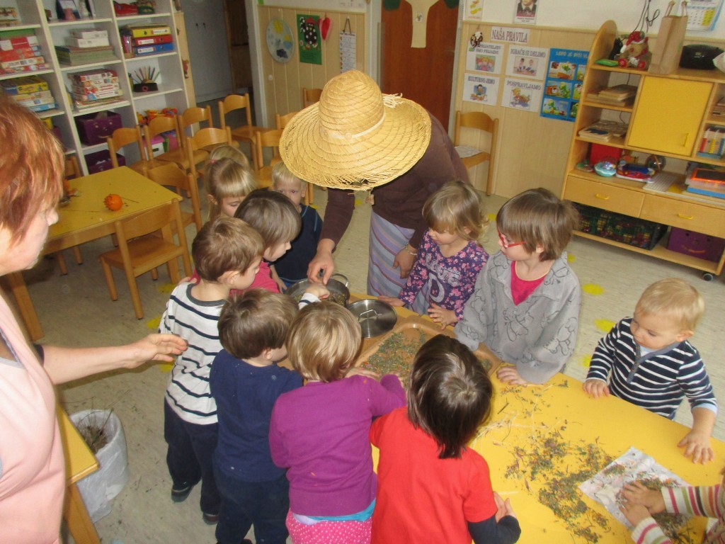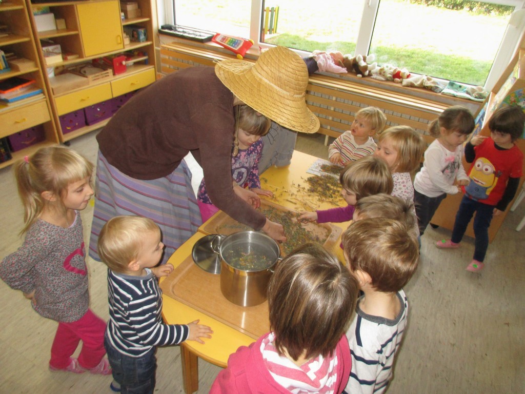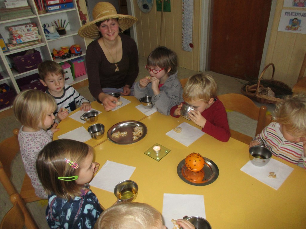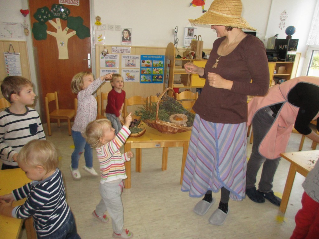 Z značilnim oblačilom in pokrivalom, košaro različnih zelišč in čajev je vstopila v igralnico ter jim predstavila svoj poklic zeliščarke. Že po nekaj trenutkih, ko so smukali zelišča je po igralnici prijetno zadišalo. Uživali so v vonjanju in smukanju posušenih cvetov in listov.Vsak si je napolnil svoj mošnjiček s čajem, ki ga je lahko odnesel domov. V vrtcu pa so skupaj skuhali domači, dišeči, praznični čaj. Iz začimb so si pripravili tudi dekoracijo, ki je polepšala njihovo praznično čajanko. Ob mirni glasbi, pitju prazničnega, pomirjujočega čaja, sladkanjem z medenjaki, ki so jih spekli prejšnji dan je minilo prijetno dopoldne, ki jih je povezalo in umirilo. Še dolgo popoldan se je širil prijeten vonj zelišč po vsem vrtcu.
