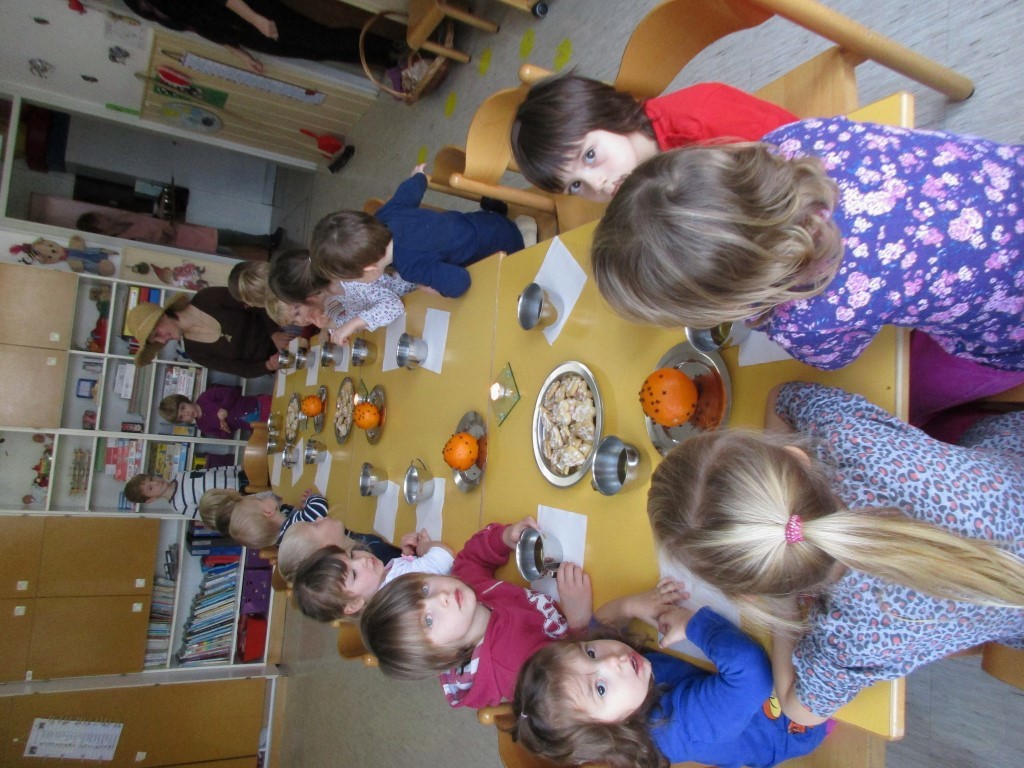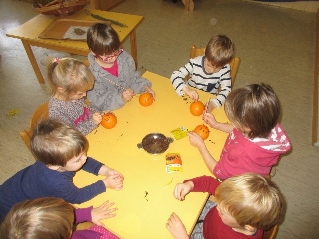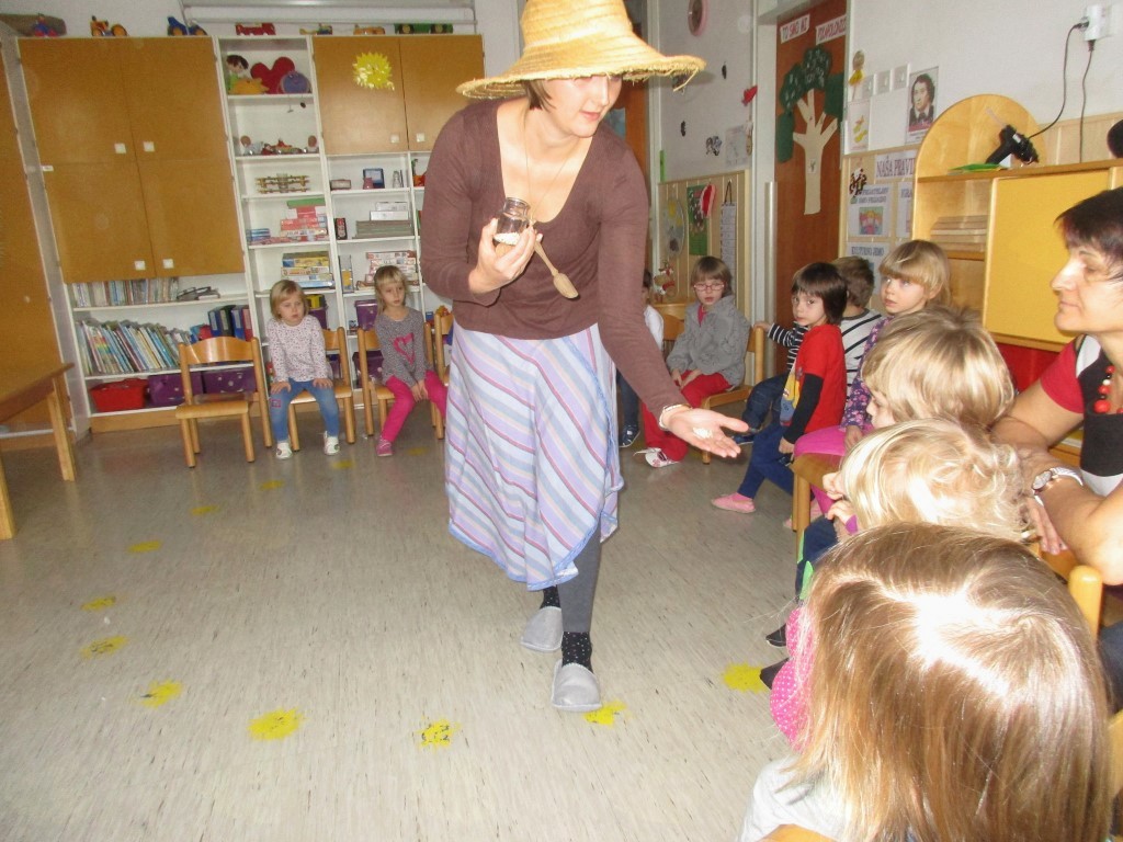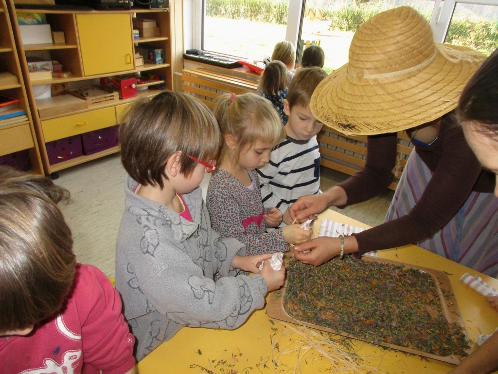 Z značilnim oblačilom in pokrivalom, košaro različnih zelišč in čajev je vstopila v igralnico ter jim predstavila svoj poklic zeliščarke. Že po nekaj trenutkih, ko so smukali zelišča je po igralnici prijetno zadišalo. Uživali so v vonjanju in smukanju posušenih cvetov in listov.Vsak si je napolnil svoj mošnjiček s čajem, ki ga je lahko odnesel domov. V vrtcu pa so skupaj skuhali domači, dišeči, praznični čaj. Iz začimb so si pripravili tudi dekoracijo, ki je polepšala njihovo praznično čajanko. Ob mirni glasbi, pitju prazničnega, pomirjujočega čaja, sladkanjem z medenjaki, ki so jih spekli prejšnji dan je minilo prijetno dopoldne, ki jih je povezalo in umirilo. Še dolgo popoldan se je širil prijeten vonj zelišč po vsem vrtcu.