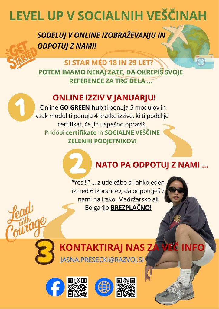 V okviru Erasmus projekta GO GREEN imamo na Razvojnem centru Srca Slovenije nekaj odličnih priložnosti za mlade, stare od 18 do 29 let.