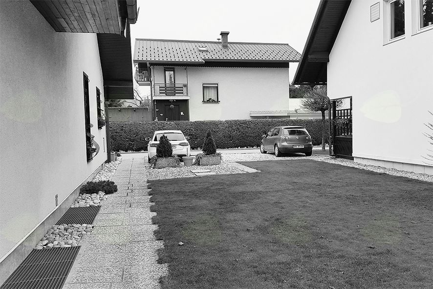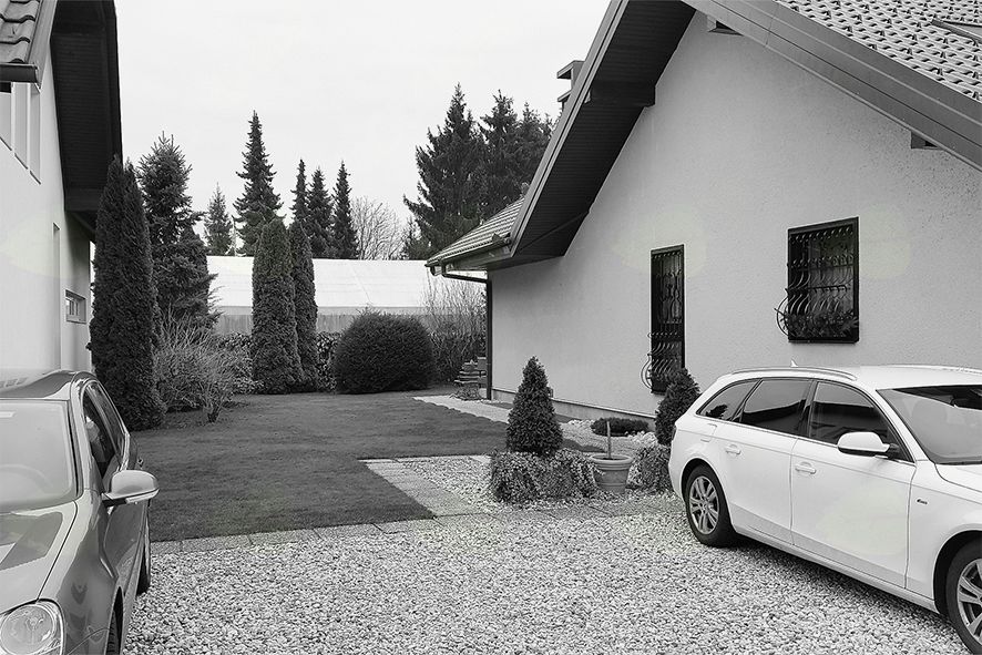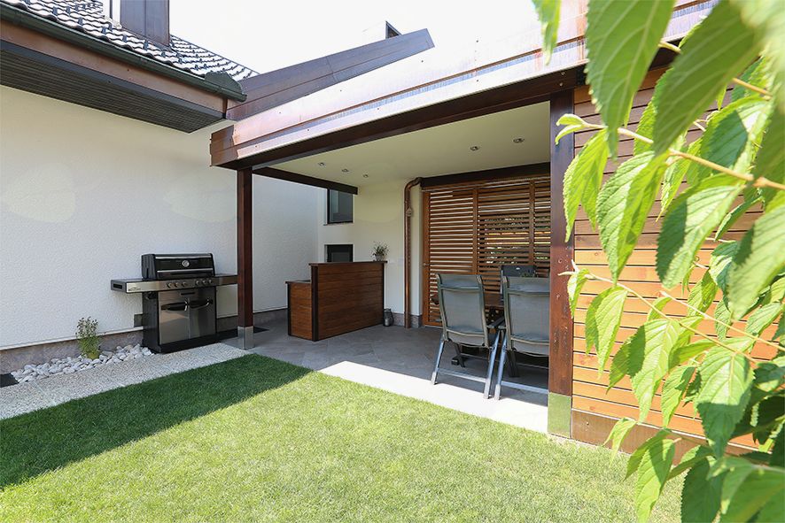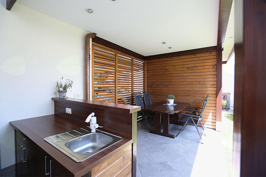 Med nadstreškom za avtomobile in gospodarskim poslopjem smo pustili prostor in s tem zagotovili nemoteno prehod preko krilnih vrat do vrtne lope. Med nadstreškom za avtomobile in pokrito jedilnico namestili drsno leseno steno in omogočili koriščenje celotnega prostora pri družinski zabavi.Na zadnji strani pa ob hiši uredili tudi mini kuhinjo s pultom ter premičnim žarom.