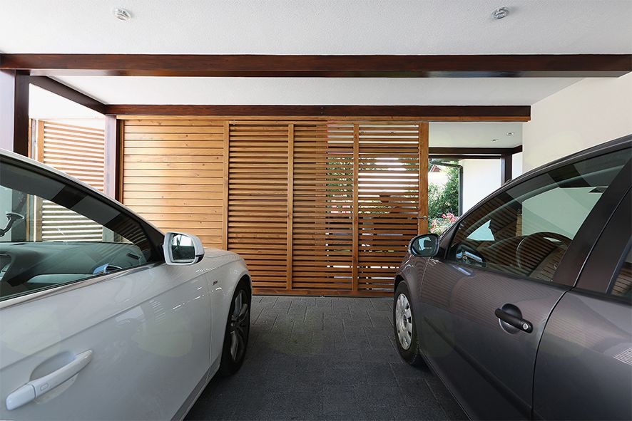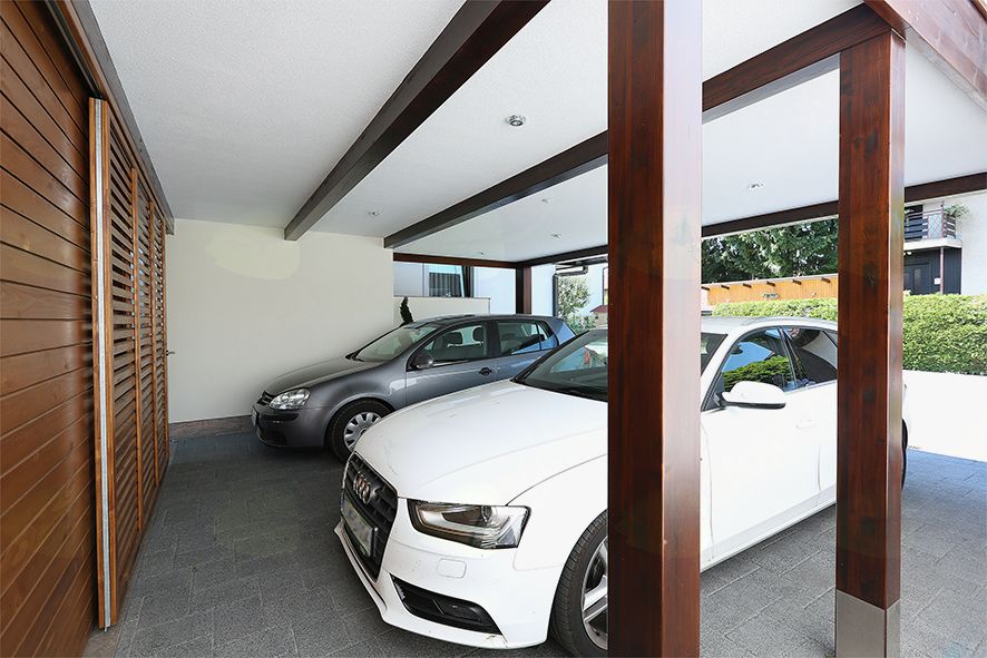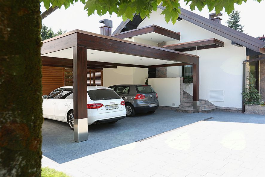 Nadstrešek za dva avtomobila smo izdelali v portalni varianti iz močnih lepljenih smrekovih nosilcev. Strop izdelali v dvojni pod konstrukciji in s tem uredili prezračevalni most med končno streho in spodnjim stropom. Vidni deli lesa so obdelali z lazurnimi premazi, strop je obložen s stirodurjem in končnim fasadnim slojem. Na terenu so se izravnale tudi višine, dvorišče tlakovalo, zadnji del objekta pa smo postavili na betonsko ploščo, obdelano s keramiko.