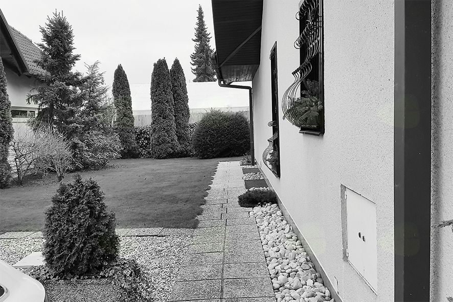 Takoj ob stanovanjski hiši smo locirali betonsko stopnišče, obloženo z naravnim kamnom, po katerem je možen prehod iz sprednje ali stranske strani. Stopnišče je nadkrito z nadstreškom, obod je lesen, svetlobo pa prepušča kaljeno peskano steklo. Prav tako smo obzidali tudi vetrolov in ga pokrili z ravno streho. Svetlobo v vetrolov pa spustili skozi zadnje okno in vhodna vrata. Pod stopniščem smo z zadnje strani pridobili še prostor za skladiščenje stvari, ki jih pogosto ne potrebujemo.