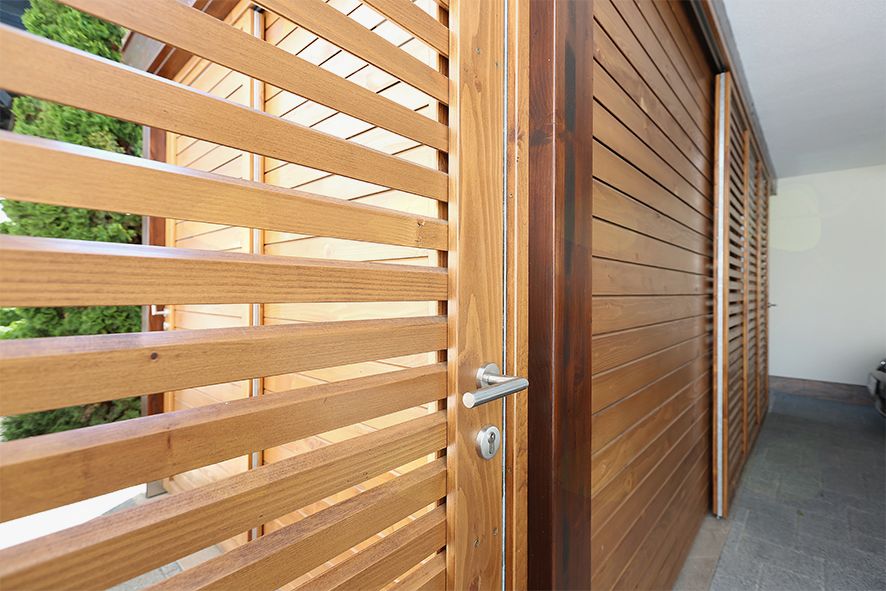 V sodelovanju z naročnikom so nastali lepi detajli zakritja kovinskih nosilnih sider s pločevino, te detajle smo prenesli iz hiše. Drsna stena je narejena iz drobnih letvic, s tem smo naredili večjo zračnost. Uta je narejena iz letvic, ki so porezane pod kotom, da je prav tako prezračevana. Robovi streh objektov so obdelani z bakreno pločevino, za pokritje pa je uporabljena bitumenska kritina. V lesenih konstrukcijah je skrita tudi vsa elektrika, ki je napeljana iz elektro omarice, skrite v vrtni uti. Celoten objekt je obsežen a se je premišljeno vkomponiral v prostor .Rešitev in kvalitetna izvedba sta obogatili končno podobo.