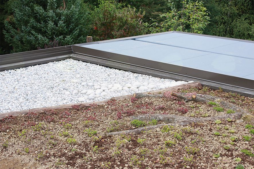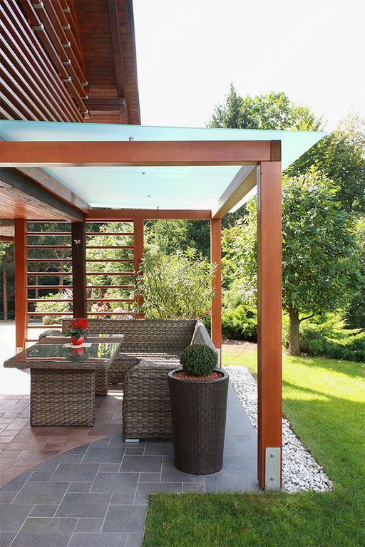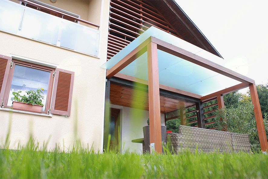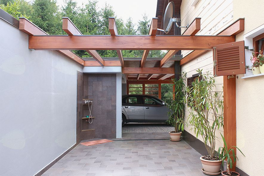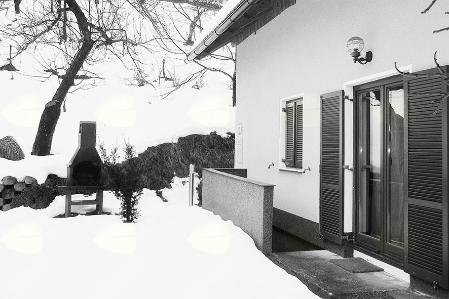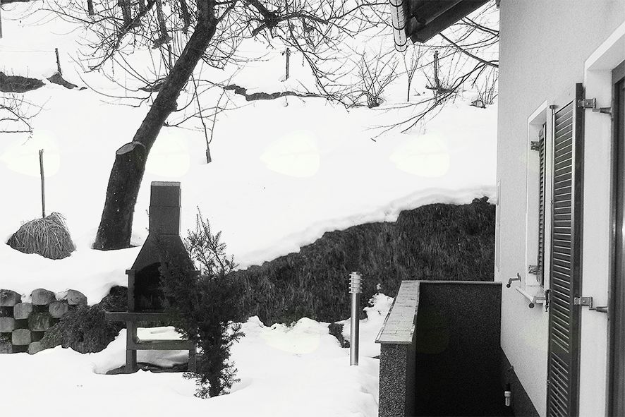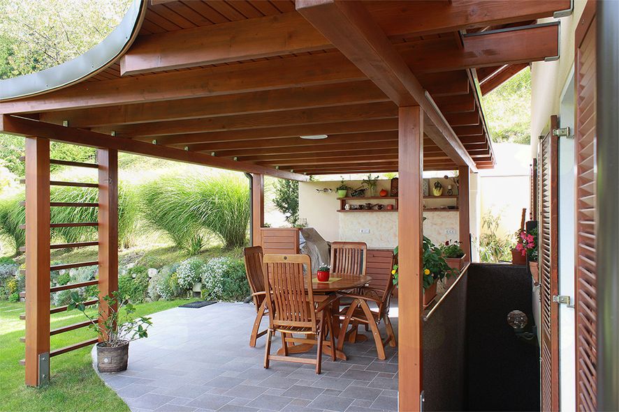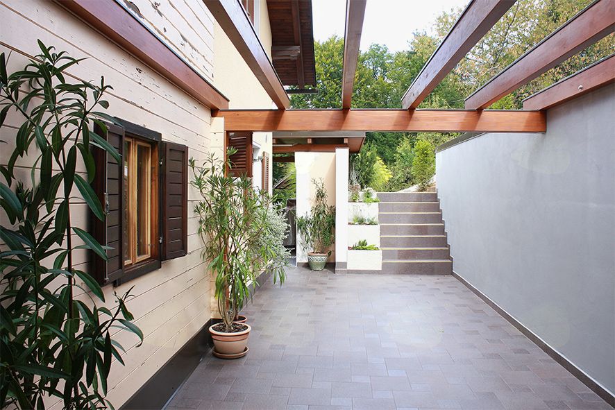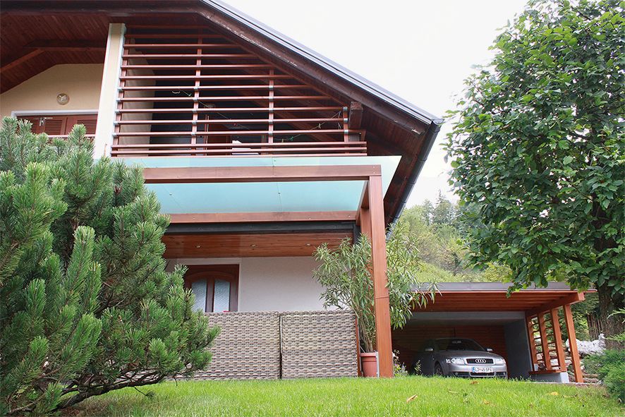 Južni nadstrešek pred vhodom je pokrit s steklom, kjer lahko kljub nizkim temperaturam za zunanje bivanje, pod njim uživamo že zgodaj spomladi ali pozno jeseni. Posodobljeni balkonski ograji smo dodali letvično formo do vrha slemena ter na zidani strani hiše namestili stekleno pregrado. V času poletne pripeke je najprijetnejše pod nadstreškom letne kuhinje, ki tudi kletne stopnice in notranje prostore ščiti pred vdorom zahodnih padavin. Parcela je na tem delu polkrožno oblikovana, zato smo z objektom sledili obliki in ga vpeli v betonski zid, ki podpira brežino. Prednosti zunanje jedilnice so mobilni žar, ki je estetsko prikrit z odpirajočimi vratci, tudi sezuvati se ni potrebno, mimogrede pa zahodna lega ponuja najlepši razgled v dolino in na pridelovalni vrt. Iz kuhinje pot vodi do stopnišča in zeliščnih gredic, zeleno-peščene strehe nad hišo ter intimnega severnega prostora, kjer poleti zadremamo na ležalniku ali se ohladimo pod zunanjim tušem. Dodana pergola optično zmanjša višino hiše in poveže prostor z vkopanim avtomobilskim nadstreškom. Le-ta je pritrjen na betonsko lopo z lesenimi vrati, ki služi kot kolesarnica in shramba.
