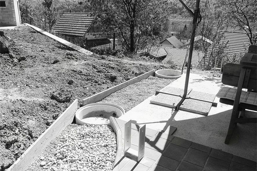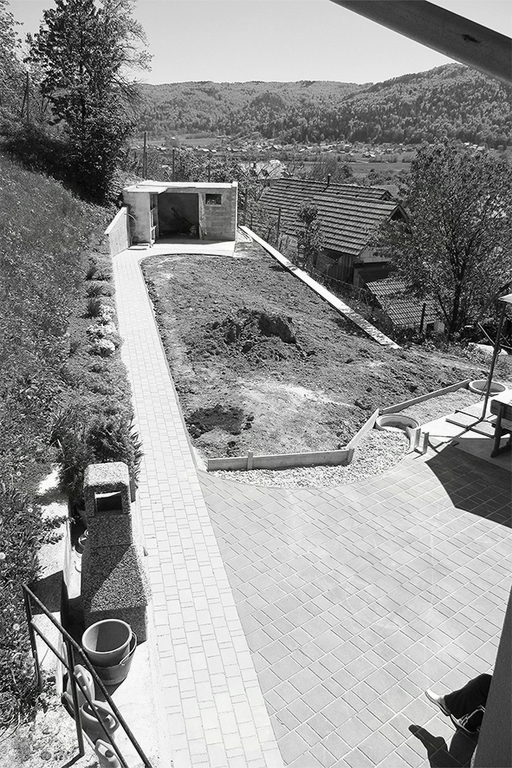 Lastniki so se odločili, da zelenjavni vrt, ki je v preteklosti služil pridelovanju vrtnin, zamenjajo za ravno travnato površino, na kateri se odlično počuti tudi hišni ljubljenček. In na zaključku parcele stari zajčev hlev preobrazijo v vrtno uto. Ohranili smo obstoječi zidani skelet, naredili novo streho ter dodali leseni panelni steni z vrati in prezračevalno rešetko. Urejeno enoto ob previsu stanovalci potrebujejo za shranjevanje vrtnega orodja, opreme ter za zimsko spravilo balkonsko vrtnih rastlin.