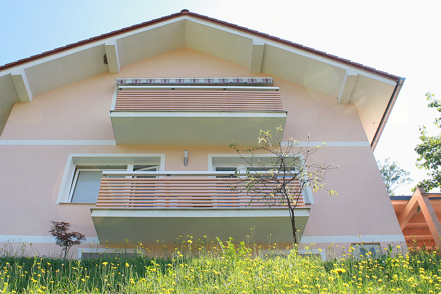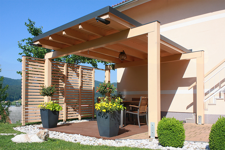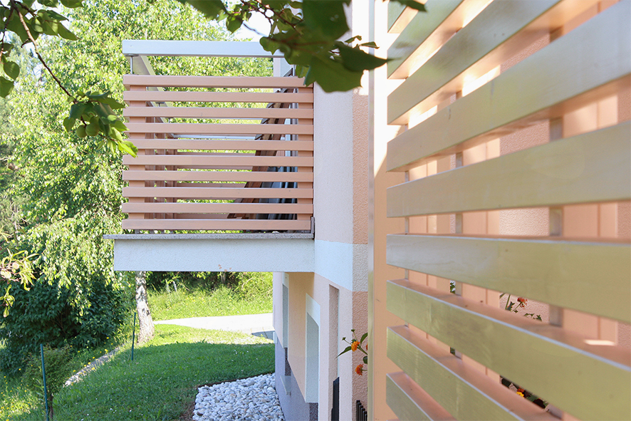 Na terasi smo na točkovna kovinska sidra postavili leseni nadstrešek, ki ima zaradi stopniščnega dostopa iz notranje dnevne sobe zamaknjeno streho od stebrov navznoter. Dodana je tudi horizontalna stena, ki ščiti pred vetrom, močnim popoldanskim soncem in nudi zasebnost. V pokritem prostoru smo na tla dodali še lesene podnice, po katerih se lahko stanovalci sprehajajo bosi. Podeskana streha z 2% naklonom ima v konstrukciji skrito odvodnavanje, pokrita je s PVC folijo in zaključena z obrobljeno pločevino. Izpod nadstreška je možen dostop pod zahodna balkona s horizontalnimi letvami, ki iz nadstropja nedvomno ponujata sanjske razglede. Oblikovni slog lesene preobrazbe izhaja iz arhitekturnega stila in marelično-bele fasade. Zatorej smo dvobarvno kombinacijo izvedli v ograji z belim ročajem, vrtni lopi z belo steno ter nadstreškom in belimi savskimi prodniki.