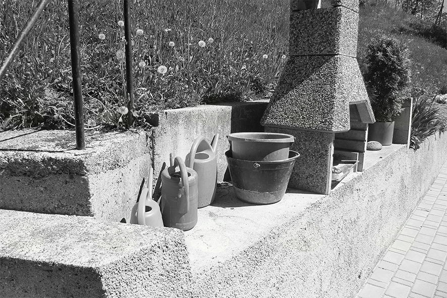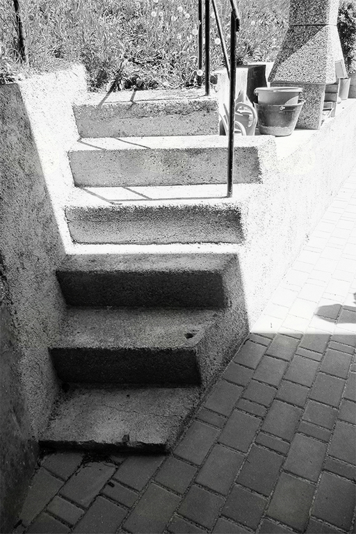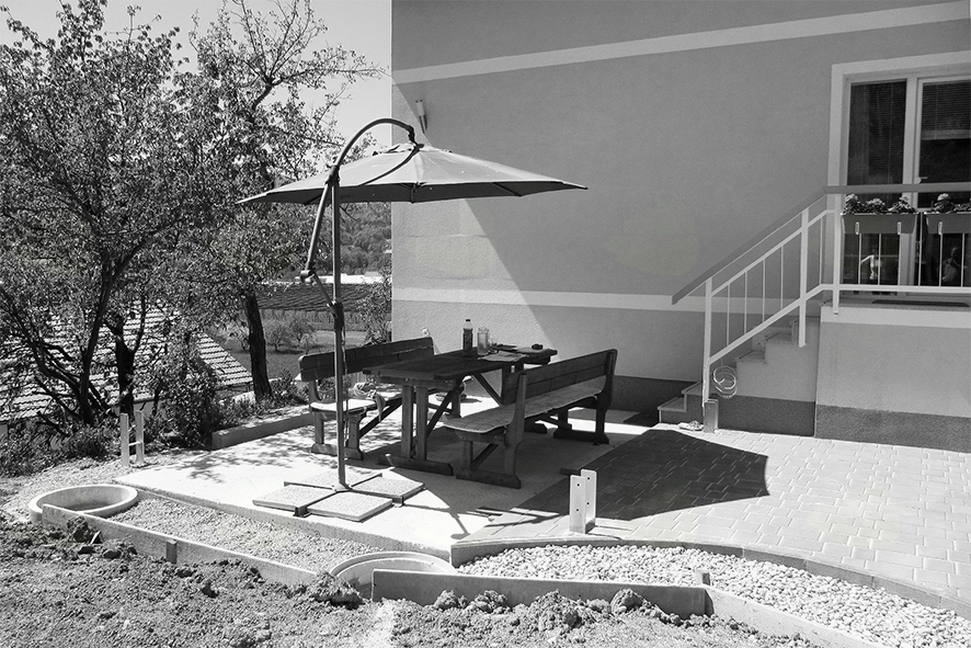 Višinske razlike premošča oporni zid, nad katerim so bile včasih zasajene vinske trte, sedaj pa so uredili cvetočo zazelenitev in letno kuhinjsko polico z betonskim žarom. Od tod v nagnjen teren na streho drvarnice vodijo stare betonske stopnice, ki smo jih oblekli v macesnov les. Kovinska konstrukcija na terasi stare drvarnice je bila pokrita z azbestno cementnimi ploščami, ki smo jih odstranili ter pridobili vzhodno teraso za sončenje in sušenje perila, odmaknjeno od pogledov. Objektu smo dodali lesene ograjne ročaje in spodnja zračna, drsna vrata, ki predstavljajo vhod v dodatne shrambne prostore ob hiši.