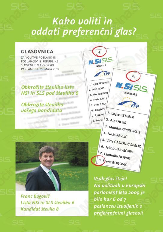 Drage občanke in občani! Ali veste, da je za vse tri projekte, ki se v tem trenutku izvajajo v občini Litija (izgradnja CČN in kanalizacijskega sistema, izgradnja osnovne šole Litija in energetska sanacija zdravstvenega doma) zaslužen prav Franc BOGOVIČ, kot takratni minister pristojen za okolje. Na tokratnih evropskih volitvah kandidira na skupni listi NSI in SLS. Če boste dali svoj glas za skupno listo NSI in SLS pod zaporedno številko (6) in obenem obkrožili številko (8), pred kandidatom Francem Bogovičem, boste storili največ za nadaljevanje dobrega črpanja EU sredstev v naši občini Litija.