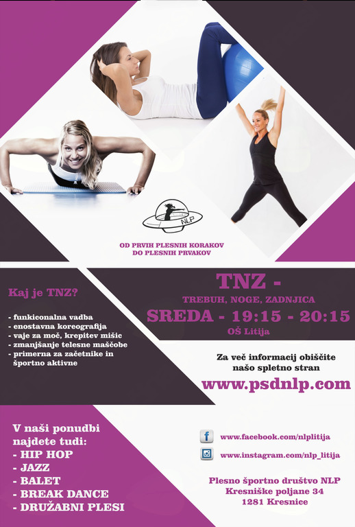 Prav tako pa je odraslim namenjena nova vadba TNZ - trebuh, noge, zadnjica, ki je namenjena oblikovanju najbolj kritičnih delov našega telesa. Skozi vadbo, ki je sestavljena iz dveh delov, poskrbimo za fit postavo in dobro počutje. Vadba poteka vsako sredo od 19:00 do 20:15 v telovadnici OŠ Litija. Začnemo 11. januarja 2017.