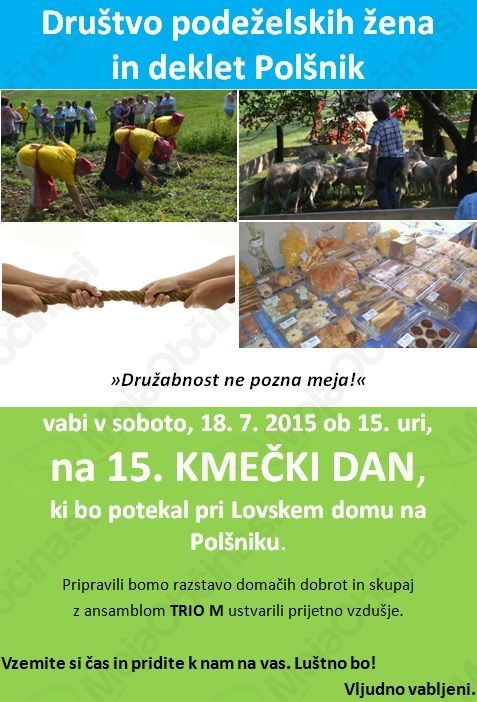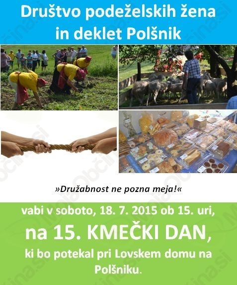 Društvo podeželskih žena in deklet Polšnik vas vabi v soboto, 18. 7. 2015, ob 15. uri na 15. KMEČKI DAN z naslovom »Družabnost ne pozna meja!«, ki bo potekal pri Lovskem domu na Polšniku.